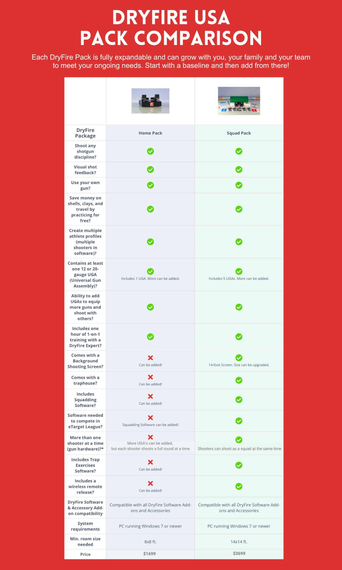 The DryFire Home Pack has everything shotgun athletes needs to get up and running: a DryFire Target Simulator, one UGA (Universal Gun Assembly), and all of the necessary software and instructions!